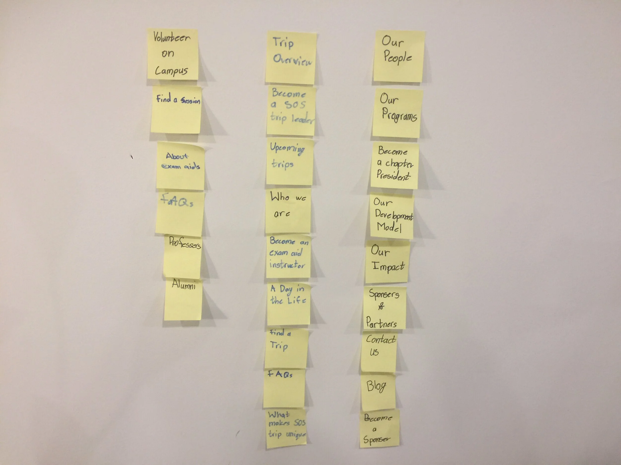 The synthesis involved all core team members including myself, the program director, and a tech analyst. We affinitized all data from both the survey and interviews to derive key areas of improvement and establish a high-level information architecture of the website. Some common themes that arose in synthesis were: